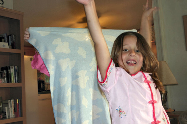 Amelia and Mary pretending to fly... Cloud Blanky was the backdrop for this performance.