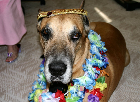 Amelia was playing dress up with poor Duke.