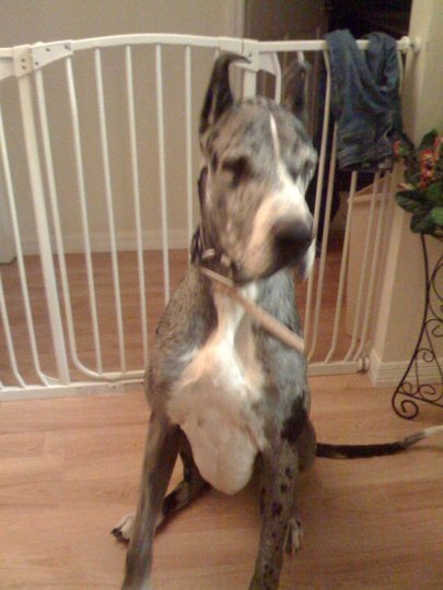 A 4 year old Great Dane we are considering for adoption. Very sweet girl, very thin currently. Recovering from heartworms.