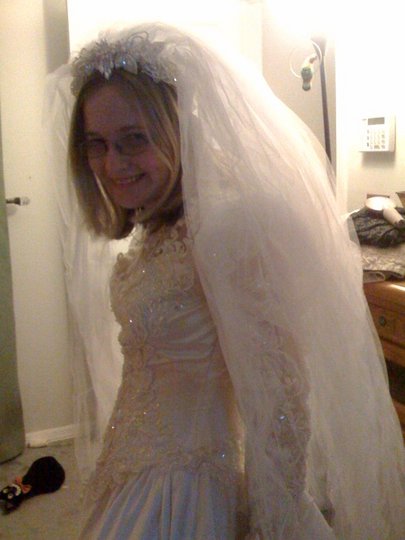 Sierra tries on her mom's wedding gown.